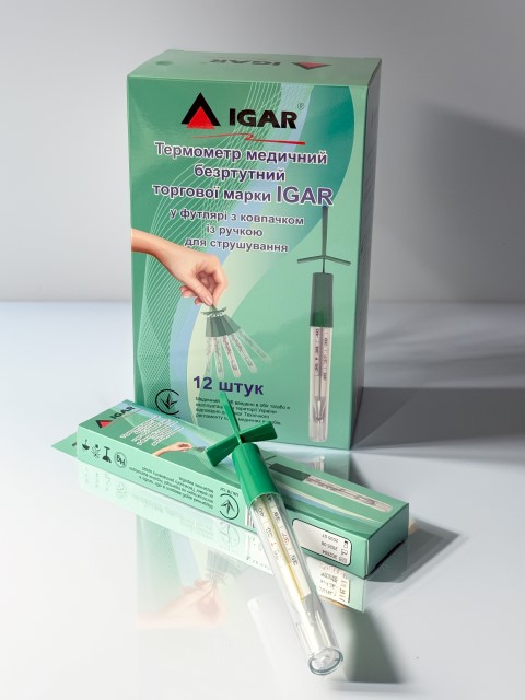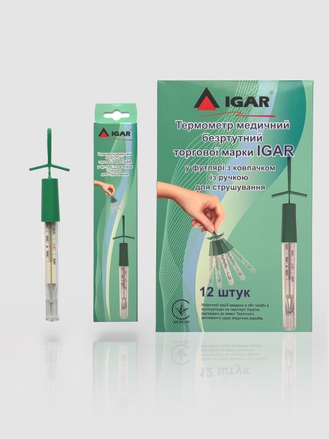 Сучасний безртутний медичний термометр торгової марки IGAR у футлярі з ковпачком і ручкою для струшування за зовнішнім виглядом і принципом використання практично не відрізняється від звичного скляного ртутного термометра, що робить його простим і зручним у щоденному застосуванні.